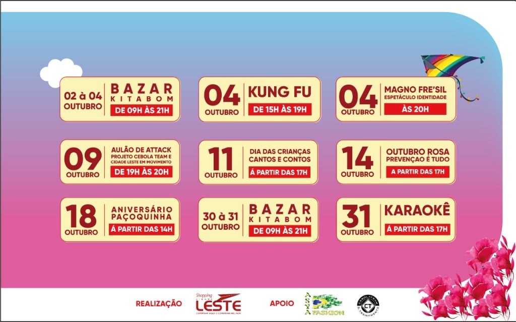 A programação inclui o Show de Kung Fu, o espetáculo Identidade Nossa, o Bazar Kitabom, o Cidade Leste em Movimento, o Dia das Crianças Mágico, o Outubro Rosa e, encerrando o mês, o Karaokê “Solte a Sua Voz no Cidade Leste”.